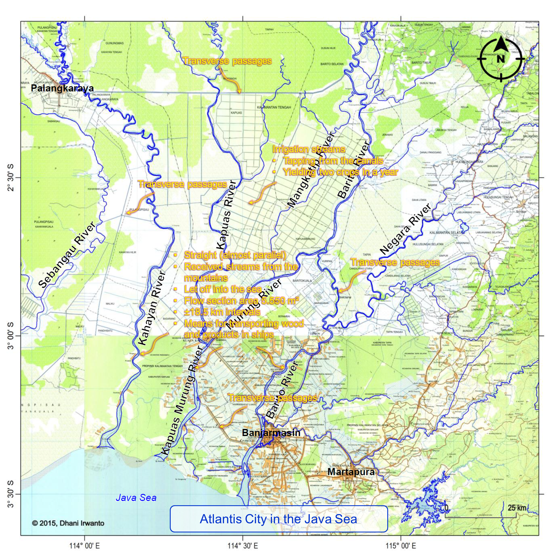 There were four kinds of channels: the circular (perimeter) ditch, the inland channels, the transverse passages and the irrigation streams. The perimeter ditch was artificial, 100 feet (about 30 meters) deep, 1 stadium (about 185 meters) wide, 10,000 stadia (about 1,850 kilometers) long, carried round the whole plain, received streams from the mountains, winding around the plain, meeting at the city and let off into the sea. The inland canals were straight, 100 feet (about 30 meters) wide, 100 stadia (about 18.5 kilometers) intervals, let off into the perimeter ditch and as means for transporting wood and products in ships. The transverse passages were cut from one inland canal into another. The irrigation streams tapping from the canals were meant to irrigate the land in the summer (dry season) while in the winter (rainy season) had the benefit of the rains.