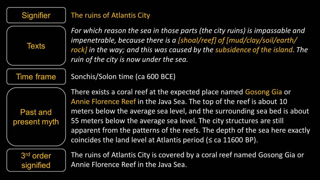 Using a unique puzzle-model approach, each narrative element from Plato’s dialogues is analyzed as a semiotic “piece” and systematically compared to real-world evidence. The principles of consilience and structured reconstruction guide the integration of independent data—ranging from ancient myth and oral transmission to modern bathymetric surveys and environmental science. The result is a robust, scientifically grounded framework that identifies Sundaland—and the Java Sea region in particular—as the most plausible location for Atlantis, with the Gosong Gia coral reef as the likely site of its lost capital.
